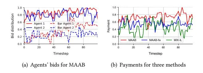 In Figure 6(b), we also plot the payments for MAAB, MAAB-fix ( ) and MIX-IL across each timestep. We find that approaches with bidding bar (MAAB, MAAB-fix) outperform the one without it (MIX-IL) in terms of the payments, which implies that the bidding bar could improve the revenue. Besides, payments of MAAB are higher than MAAB-fix, which suggests adaptively setting the bidding bar is superior to a static one.
