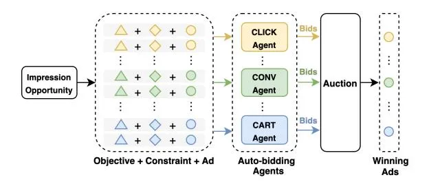 CART Agent, which optimize the number of clicks, purchase conversions and add-to-carts under budget constraints, respectively. These auto-bidding agents compete with each other by bidding for each ad display opportunity (impression opportunity). After receiving an impression opportunity, the platform launches an ad auction for the participating auto-bidding agents, each of which places a bid according to the advertiser’s objective and constraint, as well as the predicted value (e.g., pCTR, pCVR or pCART) of this impression opportunity. After collecting bids from all the agents, the auction mechanism determines the winning advertisers and the corresponding payments.