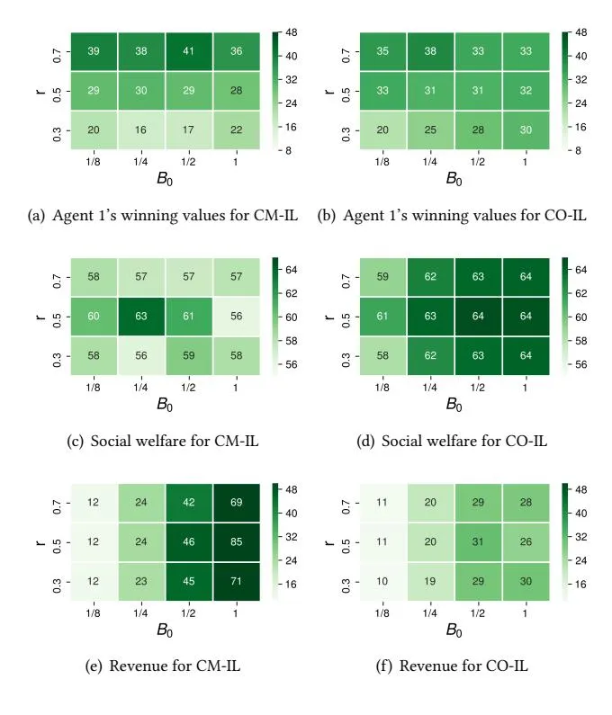 This indicates that agent 1 dominates most impressions by bidding aggressively, leading to a phenomenon of oligarch [4]. The emergent oligarch worsens the social welfare. As shown in Figure 2(c) and Figure 2(d), CM-IL achieves the less social welfare than CO-IL, especially in enough budget settings, e.g., when 0 = 1, CO-IL’s social welfare (64, 64, 64) are larger than those of CM-IL (57, 56, 58).