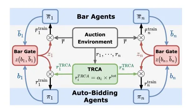 Based on the above analysis, we propose personalized bidding bar agents to improve the revenue. In Figure 3, MAAB introduces multiple bar agents , with each bar agent aiming at setting a personalized bar for the corresponding auto-bidding agent . Each bar agent shares the same observation as its corresponding auto-bidding agent. At each timestep, bar agents and the auto-bidding agents give their bidding bars and bids , respectively. But only are submitted to the auction. Then the auction environment returns the payment and the rewards . The rewards are re-assigned by TRCA, obtaining . However, using the payment p as the reward for bar agents may lead to extremely large bidding bars according to the previous discussion. To circumvent this, we propose a reward scheme called bar gate. The bar gate outputs a scalar for each pair of auto-bidding agent and bar agent, indicating whether each auto-bidding agent’s bid exceeds the bidding bar. The rule underlying the bar gate is given by