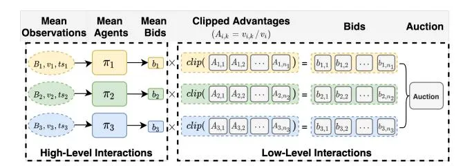Section titled “4.3 Modeling Large-Scale Multi-Agent System”In practical system, there may be millions of advertisers competing for billions of impressions every day, making it hard to train so many agents simultaneously by formulating each fine-grained advertiser as an agent, due to both the sparsity of the rewards and the limited resources (e.g., computational resources, time). We introduce our mean agent approach, which aims at providing a feasible and general method for the training of the large-scale multi-agent system for auto-bidding.