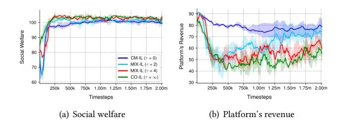 As shown in Figure 5(a), after training for 2 million timesteps, CO-IL and MIX-IL achieve nearly the same social welfare (101.2, 103.1