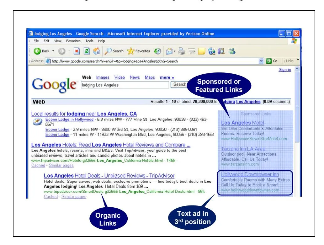 Section titled “Introduction”Paid search advertising1 allows companies to address consumers directly during their electronic search for products or services. When a consumer searches for products or services with the help of an Internet search engine, he uses keywords (a keyword can consist of multiple words) such as “Hotels Los Angeles” to start the search. A company in the lodging business can address this consumer directly via paid search. It “buys” specific keywords, e.g., “Hotels Los Angeles” and creates a text ad that will appear when a consumer searches for these keywords. The serving of a text ad is called an impression. Paid search ads are displayed in the clearly marked sponsored section of the search results page (see Figure 1). In most cases, multiple advertisers are interested in the same keywords. For example, a keyword such as “Hotels Los Angeles” is attractive to almost any lodging company in the Los Angeles area.
