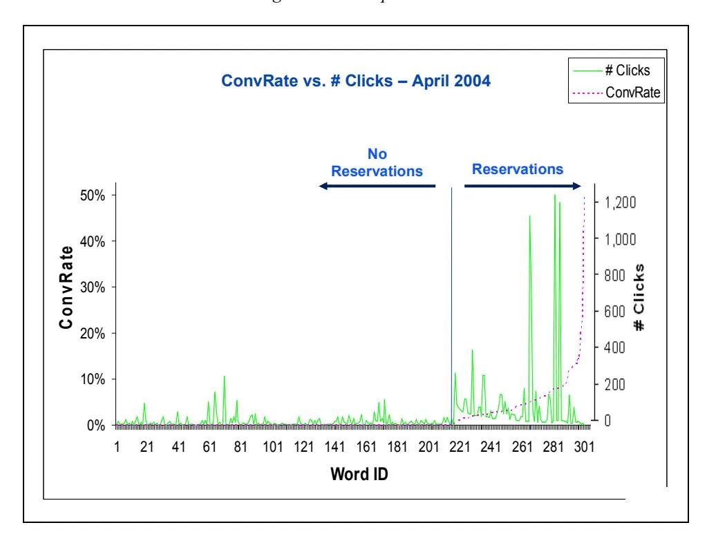 Most keywords have impressions and clicks (costs) associated with them on a daily basis. But while searches lead to impressions, and sometimes clicks, they do not always lead to sales. Indeed, average conversion rates in paid search are very low. In April 2004, for example, only 84 out of 301 keywords (27%) in our data set led to reservations (see Figure 2). Thus, on a daily, or even weekly or monthly, basis most keywords simply did not generate any sales. This observed conversion rate of zero precludes us from calculating CPR. Of course, the true, long-term conversion rate may not be equal to zero for these keywords. But because the rate might be very small, it could take quite a while for a sale to occur. In the meantime, the firm continues to pay for the clicks on its ad without any accompanying revenue to show for it.