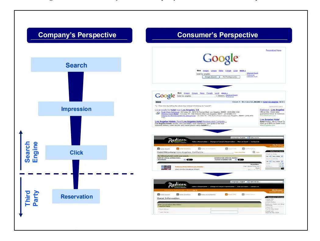 Section titled “Paid Search Advertising”How does paid search work from a company and consumer perspective? Consider the following scenario: a consumer searches using the keyword “Hotels LAX”. A company had previously selected this keyword and created a text ad. The search results page will display non-sponsored (so called organic) and sponsored search results, including the ad of the company (depending on the bid). From the company’s perspective, one impression has been generated which is attributed to the keyword “Hotels LAX”. Imagine the consumer likes the company’s text ad and decides to click on it. He is transferred to the landing page on the company’s website and the keyword “Hotels LAX” has now generated a click. The consumer then decides whether to reserve a hotel room. If he does so, the keyword “Hotels LAX” becomes associated with a reservation from the company’s perspective (see Figure 3).
