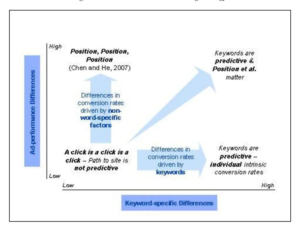 The software provided to advertisers by the search engines allows managers to change the paid search strategy on a near real time basis. The selection of the keywords and the bid per keyword can be changed at any time during the day. The software, e.g., Google’s Adwords, allows advertisers to group keywords, e.g., Google’s Adgroups, and to manage these groups of keywords. Paid search strategies are commonly managed based on these groups.