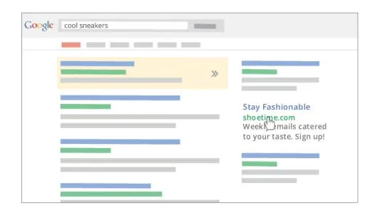 Figure 1: Sample AdWords ad on the right with different components: headline (blue), display URL (green), and description lines (gray)