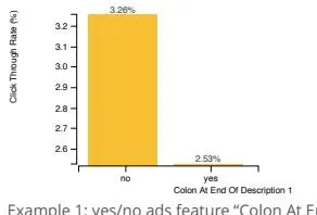 Example 1: yes/no ads feature “Colon At End Of Description 1” and impact on CTRs for treatment and control group.