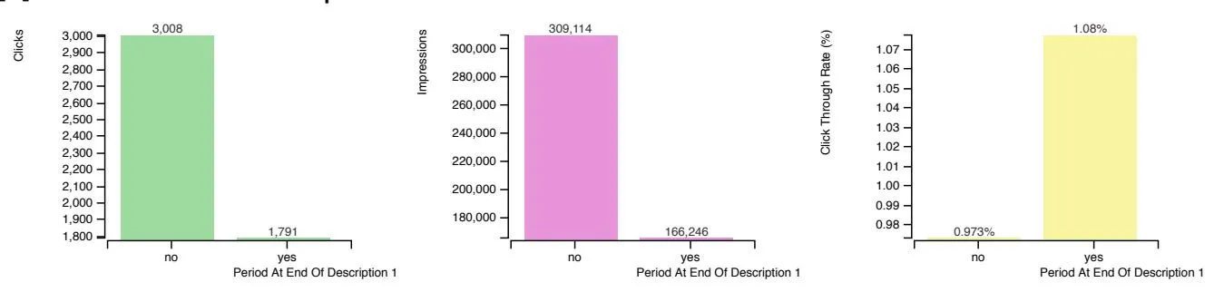 Figure 4: Output for the ad feature “period at end of description 1” for a test account with charts for clicks, impressions, and CTR, followed by random sample ads and an impact estimation based on CTR differences
