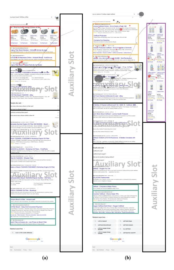 Auxiliary slots are positioned as follows. Initially, the page is divided into two sections: the main area and the right area (see Figure 2). The main area is the vertical region of the web page where search results are displayed, along with direct-top, organic-top, and organic-bottom slots. The right area is the vertical portion of the web page where direct-right slots are located. Next, N auxiliary slots are placed in the main area. Specifically, the space between the end of the last direct-top/organic-top slot and the beginning of the first organic-bottom slot is divided into N equally-sized rectangular regions of interest, ensuring no gaps between them. If the page does not contain direct-top/organic-top or organic-bottom slots, the auxiliary slots span from the top of the web page to the bottom. The value of N is a hyperparameter that can be optimised; in our setting (see Section 6.1.4), the optimal value is N = 3. Finally, for the right area we apply a simpler heuristic. If no direct-right slots are present, two auxiliary slots are placed: one in the upper-middle section and another in the lower-middle section. If direct-right slots are present, an auxiliary slot is positioned below the existing slot.