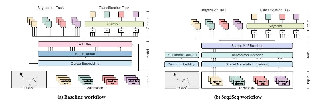 Section titled “Conclusion”We introduced AdSight, a novel Transformer-based Seq2Seq model to predict user attention in multi-slot environments such as SERPs. By leveraging mouse cursor trajectories and slot-specific metadata, AdSight achieved robust performance in both regression and classification tasks, delivering an accurate quantification of user attention. Our findings highlight the importance of incorporating slot metadata and auxiliary slots. Furthermore, the Seq2Seq architecture outperformed traditional MLP-based baselines across all tested configurations, demonstrating its effectiveness in capturing complex intra- and inter-sequence relationships, and paving the way for low-cost scalable inference of user attention.