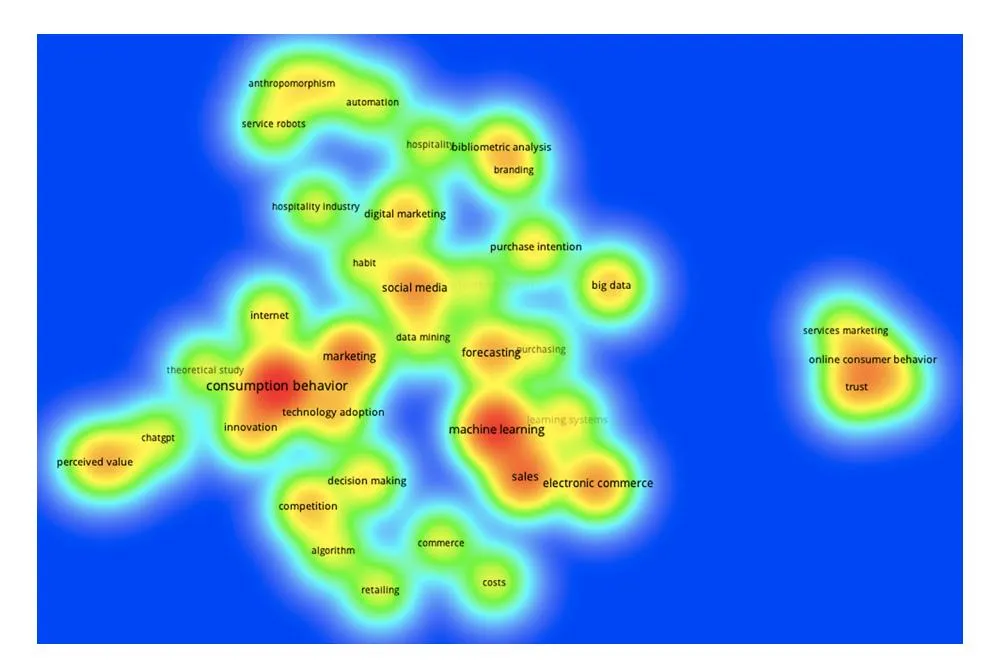 low-density ‘cold’ sections in the vicinity of ChatGPT, anthropomorphism, and service robots signify nascent streams with lower publication density but ample room for future growth. This density distribution not only underpins the network clusters but also forms a temporal proxy, whereby colder regions on the map might be interpreted as fertile ground for pioneering research that challenges or expands leading theoretical paradigms.