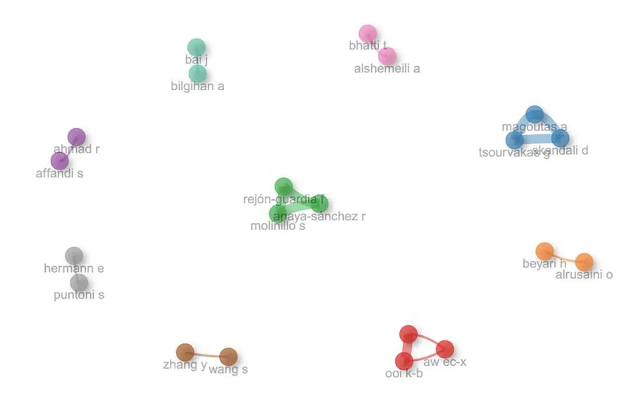 Section titled “4.2.2. Co-author network”Figure 7 shows the author collaboration network reveals a fragmented landscape of scholarly interaction within the research domain. The visualization shows several small, distinct clusters of co-authors, with most groups comprising two to three individuals who collaborate closely within their circle. Notably, there is no evidence of a central or highly connected author acting as a bridge between these clusters, indicating that research efforts are largely isolated rather than collaborative across groups. For instance, authors such as Anaya-Sánchez, Molinillo, and Guardia form a tightly knit trio, suggesting a consistent pattern of co-authorship, while other pairs such as Bhatti and Alshemeili or Bilgihan and Bai reflect dyadic collaboration without broader network integration. The absence of cross-group linkages suggests that, while active research is taking place, it tends to be siloed, possibly due to disciplinary boundaries, institutional affiliations, or the emerging nature of the field. This structure highlights opportunities for future interdisciplinary collaboration and knowledge exchange to strengthen the research community.