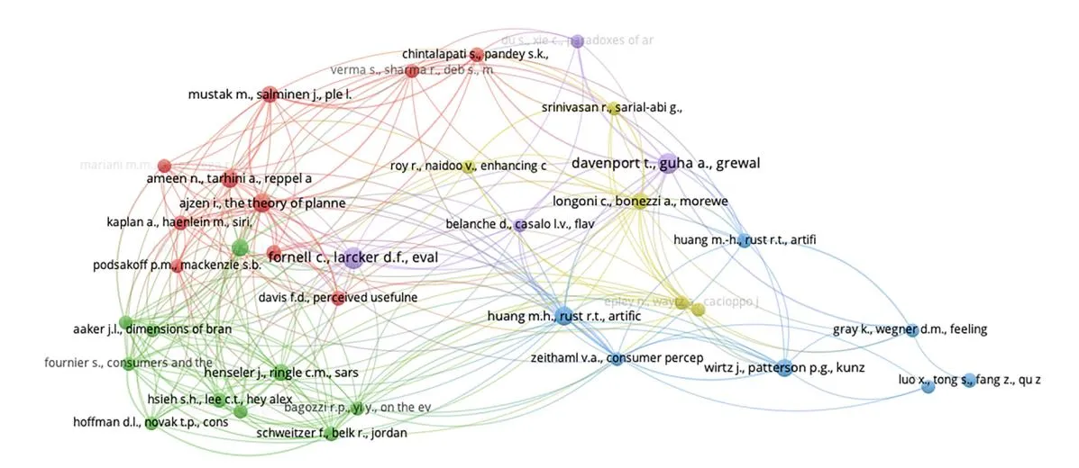 Cluster 3 ranges from theory to service applications, such as Huang & Rust’s (2018) theorizing of AI in service settings and Wirtz et al.’s (2018) examination of frontline service robots. The inclusion of Gray & Wegner’s (2012) uncanny valley hypothesis and Luo et al.’s (2019) chatbot disclosure study underscores tensions between AI’s instrumental efficacy and consumer unease. Cluster 4 discusses ethical and anthropomorphic issues, with Longoni et al. (2019) describing opposition to AI in delicate domains and Epley et al. (2007) speculating on anthropomorphism’s psychological motives. Srinivasan and Sarial-Abi’s (2021) examination of algorithmic failure emphasizes the vulnerability of consumer trust to inscrutable systems. Lastly, Cluster 5 examines the transformative impact of artificial intelligence on business strategy, as exemplified by Davenport et al.’s (2020) AI-driven marketing model and the fintech innovations described by Belanche et al. (2019), with Du and Xie (2021) warning against the moral concerns of automation.