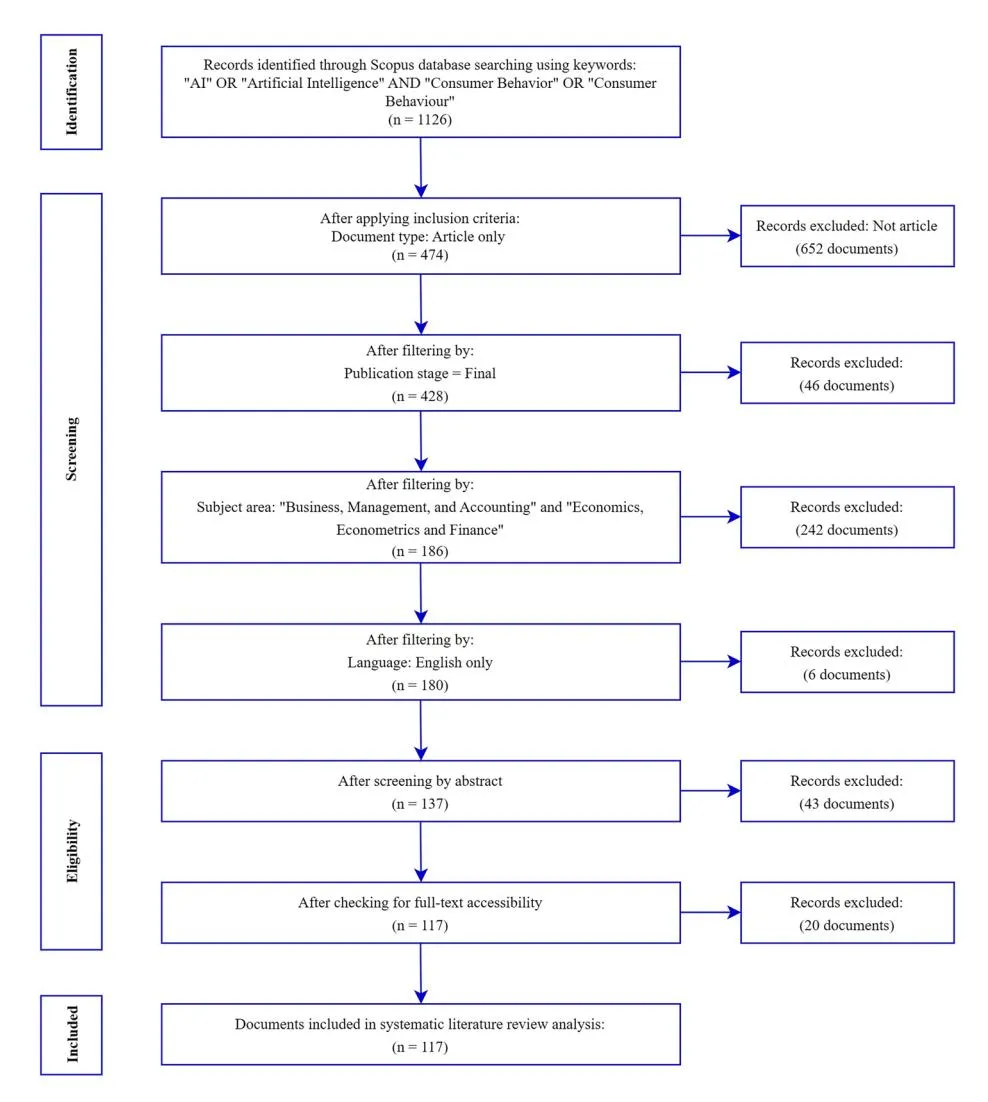 The search was conducted using the Scopus database, applying a combination of keywords: ‘AI’ OR ‘Artificial Intelligence’ AND ‘Consumer Behavior’ OR ‘Consumer Behaviour’, which initially yielded 1126 documents. Inclusion Criteria: documents categorized as articles; published in the final stage; subject areas limited to ‘Business, Management and Accounting and Economics’ and ‘Econometrics and Finance’; written in English; with accessible full-text; and passed abstract relevance screening. Exclusion Criteria: non-article document type (e.g. book chapter, conference paper, book, review); not in the final stage; outside of the defined subject areas; non-English articles; duplicates and inaccessible documents; and those irrelevant based on abstract screening.