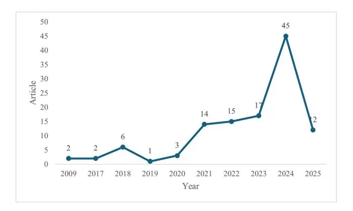 AI in consumer research reacts to technological advances and emerging demands in research. In 1995, strong computational power and algorithmic modeling were enabled through comprehensible approaches such as decision trees to examine structured consumer data (Vaid et al., 2023). These early methods bridged traditional statistical approaches with AI’s predictive potential, making them appealing to marketing researchers. Between 2009 and 2018, breakthroughs in deep learning, coupled with the rise of big data and cloud computing, facilitated the application of neural networks to unstructured data like social media content and images (Kumar et al., 2024). This study explains that AI in consumer behavior research has grown rapidly, as reflected in publication trends from year to year. Although initial exploration began in 2009 with two publications, research activity remained low until 2020. Since then, the field has experienced exponential growth, with a significant jump from 14 publications in 2021 to 45 publications in 2024, marking the peak of academic interest (see Figure 2). Although the data for 2025 shows 12 publications through April, the overall trend shows a consistent increase, driven by advances in AI technology and increasingly widespread applications in marketing.