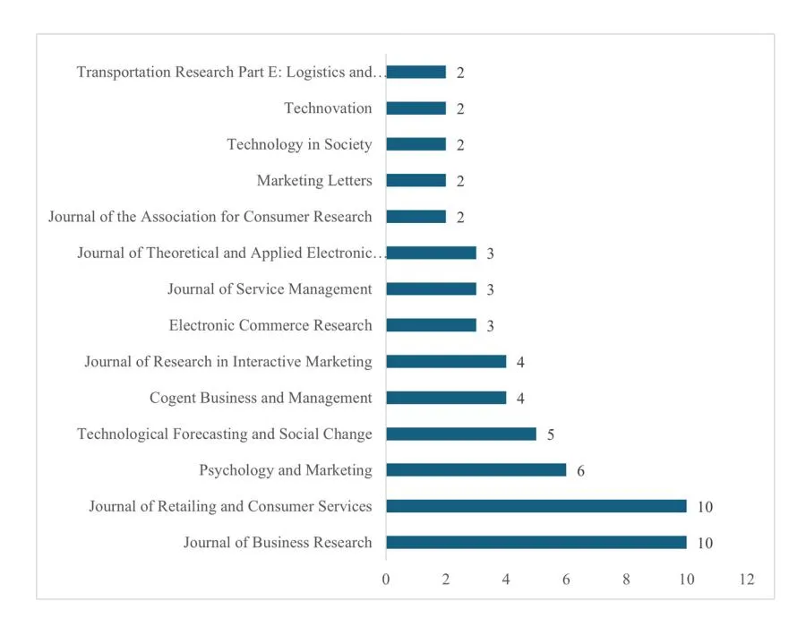 Technovation, Technology in Society, Marketing Letters, and Journal of the Association for Consumer Research each published 2 articles. This concentration on a few key journals confirms their important role in the field, especially journals focused on business, marketing, and consumer studies, which are highly relevant to the crossover between AI and consumer behavior.