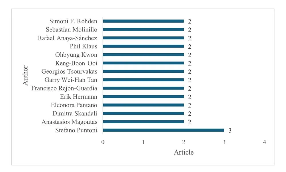 Figure 4 displays the distribution of top contributing authors in our dataset, illustrating the number of publications per researcher. Among the 117 articles retrieved from our systematic literature review, Stefano Puntoni emerges as the most productive scholar with 3 publications, distinguishing him as the only researcher exceeding the two-publication threshold in this domain. Following Puntoni, a cohort of 13 researchers—Simoni F. Rohden, Sebastian Molinillo, Rafael Anaya-Sánchez, Phil Klaus, Ohbyung Kwon, Keng-Boon Ooi, Georgios Tsourvakas, Garry Wei-Han Tan, Francisco Rejón-Guardia, Erik Hermann, Eleonora Pantano, Dimitra Skandali, and Anastasios Magoutas—have each contributed 2 publications to the field.