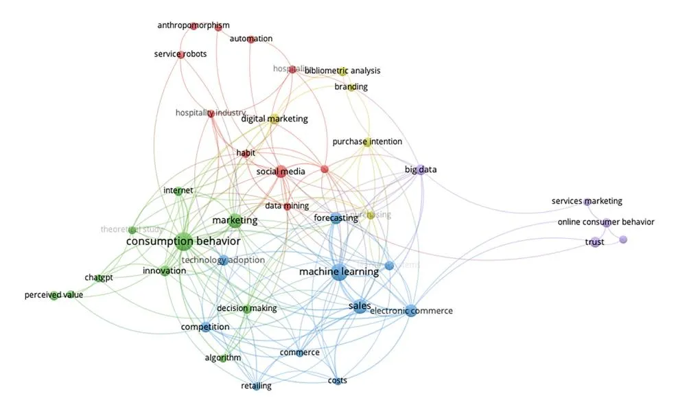 The largest cluster, colored blue, is defined by terms such as machine learning, electronic commerce, sales, and forecasting, indicating a strong area of research concerned with predictive analytics related to online retailing performance. Nearby, the green cluster deals with consumption behavior, technology acceptance, and perceived value, revealing a significant use of the Technology Acceptance Model (TAM) and the Unified Theory of Acceptance and Use of Technology (UTAUT) to elucidate consumer interaction with AI-powered services. A third, red-colored cluster emphasizes social media, electronic marketing, and service robots, pointing to emerging interdisciplinary scholarship at the nexus of robotics, media richness, and anthropomorphic design in hospitality contexts. Conversely, the yellow cluster—founded on big data, branding, and purchase intention—emphasizes the strategic use of large-scale analytics to brand equity and confirmation-expectation models. Finally, the purple cluster, including trust, online consumer behavior, and services marketing, emphasizes sustained research attempts at conceptualizing and quantifying the effect of consumer trust in electronic commerce transactions, with frequent applications of extensions of the Theory of Planned Behavior (TPB).