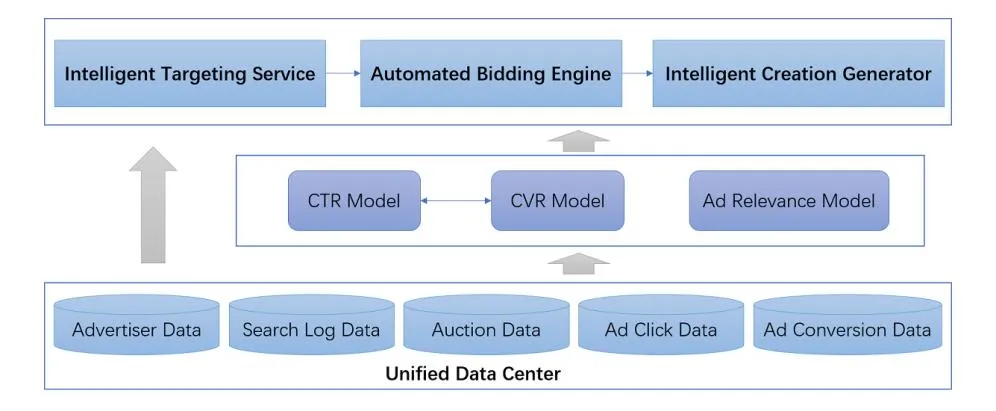 Section titled “3 SYSTEMS ARCHITECTURE”Before diving into how the system is built, let us first introduce the overall system architecture of AiAds. As showed in Figure 2, the whole system is composed of five modules: the unified data center, the basic models of search ads, the intelligent targeting service, the automated bidding engine, and the intelligent creation generator. The unified data center provides the basic data requirement for the downstream tasks and consists of several data sources such as ad click data, ad conversion data and search log data, and so on. The basic CTR and CVR model are built to model and predict the click-through rate and conversion rate for each ad. Some ad relevance models are built to quantize the relevance between queries and ads, and to optimize the user experience. When users submit search requests, the intelligent targeting service retrieves all the related ads directly, and the automated bidding engine produces bid prices for each ad based on the real-time models and the target of advertisers. Finally, based on the candidate materials and contents, the intelligent creation generator makes the combination and the generation of ad creations to display.