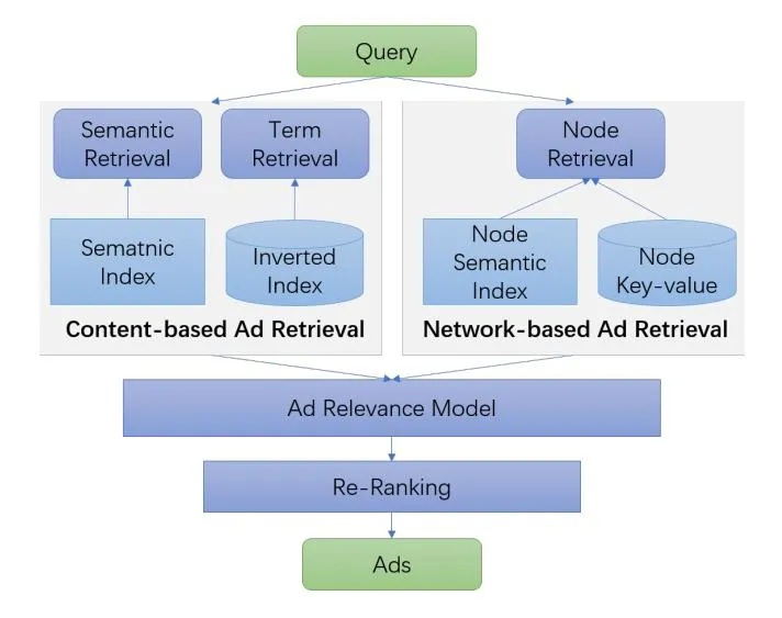 The intelligent targeting service is an end-to-end ad retrieval framework and can achieve direct matching from query to related ads. The overall architecture of the intelligent targeting service is presented in Figure 4, and two types of ad retrieval models are used in this service which can provide more ad candidates by utilizing diverse data sources.