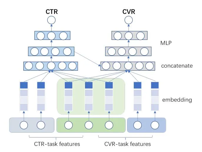Section titled “4.3 The CVR Model”From the equation (6), the pcvr play an important role in the automated bidding strategy. If the CVR models are only trained with samples of clicked impressions, the model will have poor generalization ability in plenty of un-clicked impressions such as new ads. To tackle this problem, we put the training of the CVR model and the training of CTR model together by using a multiâĂŚtask model architecture and shares the lookup table for the embeddings of common features. The overall model architecture is presented in Figure 3. Moreover, as the conversion types are diverse, the network of CVR model also adopts a multiâĂŚtask architecture.