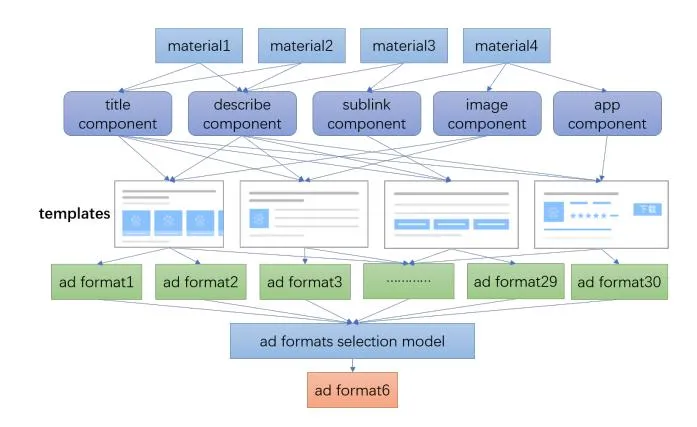 Based on this framework, the advertiser only needs to prepare the materials such as text description about their business, promotional products, images in different sizes, app package, phone number, and so on. The system will also extract and generate some materials from advertiser’s landing page or other external resources. Based