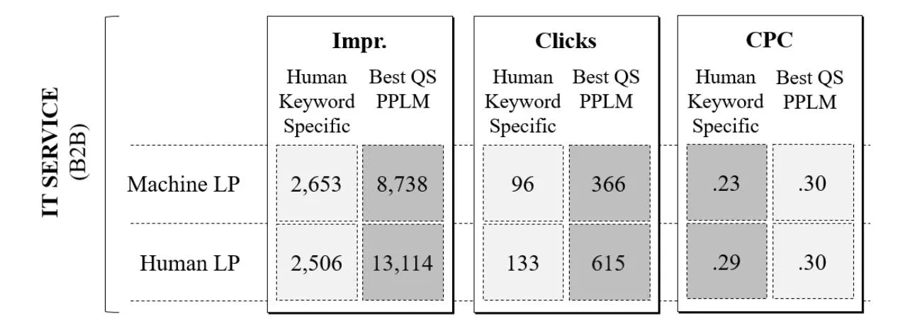 Section titled “The Role of Landing Page Content”Having demonstrated the potential for our semi-automated approach to generate content that outperforms human-generated content, we next consider factors that may moderate the impact of using generative AI in our application. One important factor is the quality of the LP, as the alignment between the LP and the target keyword is instrumental to the performance of sponsored ads (e.g., Ghose and Yang 2009; Amaldoss et al. 2015). To examine the differential effect of a well-optimized LP against improved ad content generation in boosting SEA performance, we conducted another experiment with our IT and SaaS partner company. In this study, we manipulated the target LPs for a subset of 18 keywords from the “IT Support” list by contrasting the original LPs (condition “Human LP”) with a corresponding set of highly content-optimized, but otherwise identical LPs (condition “Machine LP”) that were created using a generative AI-supported SEO tool (e.g., Reisenbichler et al. 2022) to obtain high organic search engine rankings. In both the machine- and human-generated ad content conditions, each piece of ad copy is produced for an individual keyword, resulting in a total of 72 pieces of