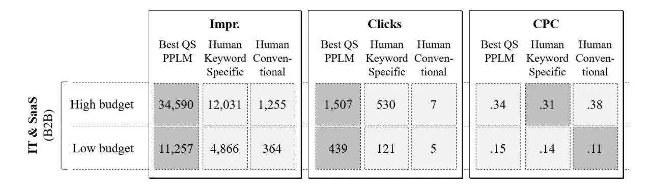 To elaborate more on the trade-off between ad quality improvement and cost implications, we use the full framework proposed in Figure 2 in our next experiment. Working with historical ad content and performance data for a subset of keywords from our IT and SaaS partner company, we derived CPC predictions for the machine generated ad content. Rather than restricting our focus to , we test the performance of generated ads with the lowest predicted CPC (condition “Lowest CPC PPLM”). As shown in Table 4, the semi-automated