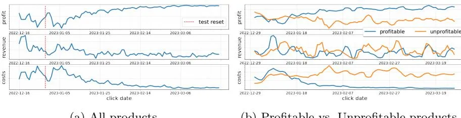Section titled “6 Experimental results and discussion”The test took place from December 16th, 2022 (date of deployment) to March 25th, 2023, in a large European country. Figure (3a) illustrates the aggregated dynamics of partial profit (top), revenue (middle), and costs (bottom) for a subset of 180 products. To protect business-sensitive information, we have concealed the y-axis and only report the relative behavior. As we can see, beginning in January, the system displays a robust positive trend in profit. Notably, there are two peaks in costs that conclude in mid-January, corresponding to exploration periods within our system. Following January 25, the revenue maintains relative stability, while costs continue to decrease, resulting in an upswing in profitability.