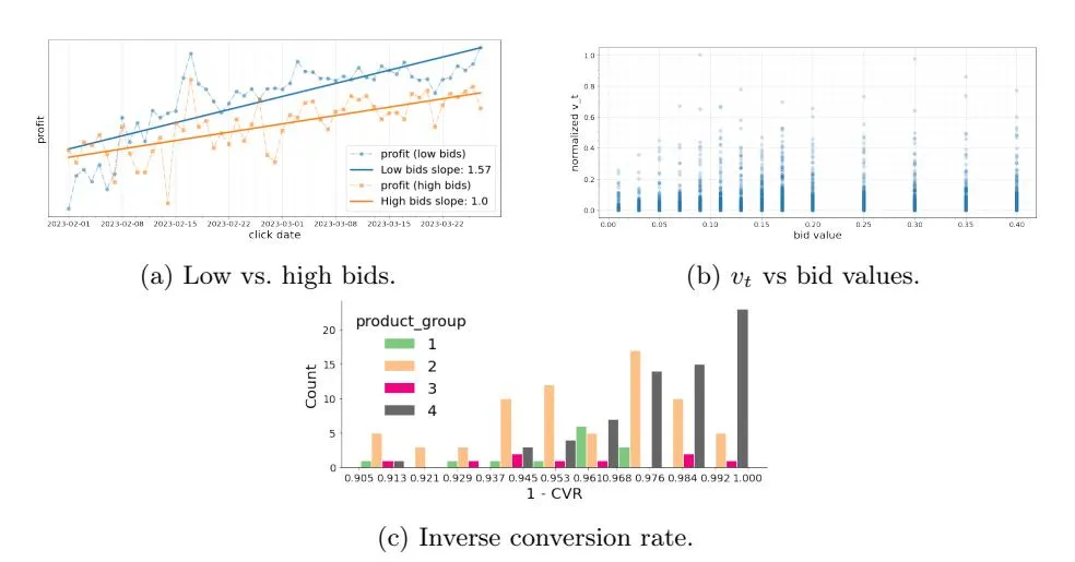 Fig. 4: (4a) Profit dynamics for products with higher (than 10 cents) and lower (than 10 cents) bid values, aggregated over highly profitable and profitable product groups. To preserve business-sensitive information, regression slopes represent the normalized linear regression fit. (4b) Distribution of normalized vt across the bid values.. (4c) Distribution of inverse conversion rate categorized by product group: 1 – profitable, 2 – emerging, 3 – unprofitable, 4 – low-traffic.