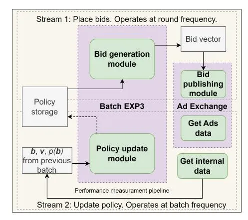 Bidding system Our bidding system is designed to match the modularity of the bandit methodology in an efficient way, including the bid generation and policy update components and the performance measurement pipeline. The bidding system contains two streams [19]: the first stream is responsible for bid placement in the ad exchange; the second stream unifies the performance measurement pipeline and the policy update component.