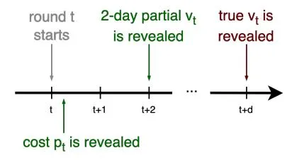 Finally, the bidder does not observe the outcome of bid immediately after reward contest ends. Instead, the outcomes are batched in groups and observed after some delay. Formally, let be a grid of integers such that , where M is number of batches. It defines a partition where and for . The set is the k-th batch. Next, for each , let be the index of the current batch . Then, for each , the bidder observes the outcome of reward contest only after batch ends, for some positive integer .