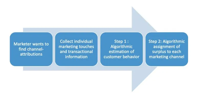Figure 1: The workflow used by the marketer to optimize marketing spend across channels and campaigns. Starting with the business question, data collection, estimation of the behavior model, and credit assignment.