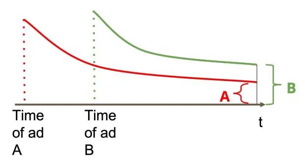 Figure 2: This figure describes the main idea behind the underlying model. Along the timeline are displayed the times of the two ads A and B, the height of the lines denote the main effect of these ads, as time passes, the effect decays, this is denoted by the two curves. At time t, the remaining effect of the two ads is denoted by the height of the curves at this point. In addition to the main effects, there may be an interaction between all the different channels that this person has been exposed to.