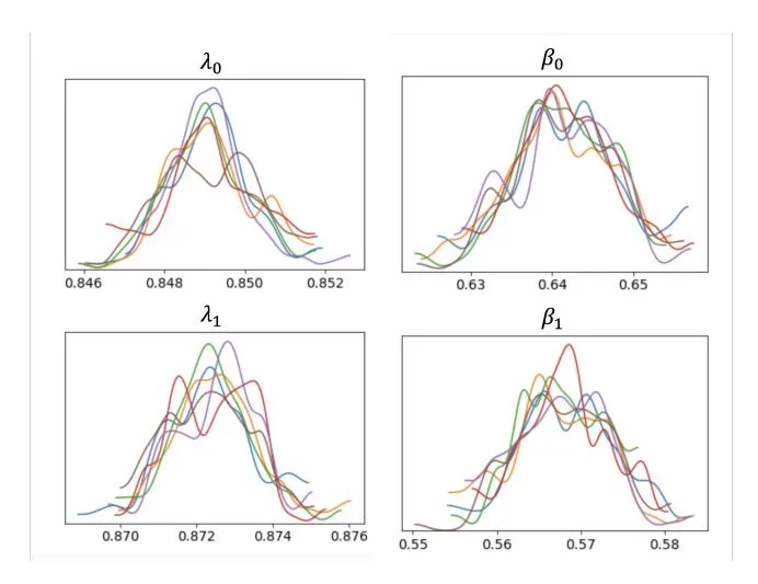 We estimated the posterior through Markov Chain Monte Carlo (MCMC) methods implemented in the STAN framework [15]. Over multiple runs, we observed that the posteriors were sharp, the chains mixed well and the parameters were recovered well. See Figure 3 for a few posteriors of β and λ corresponding to channels {0, 1}. Notice that almost all mass is concentrated within an interval of width 0.02 (with less than 4% error). This provides us confidence that our strategy can recover the true underlying parameters from such a non-linear regression problem.