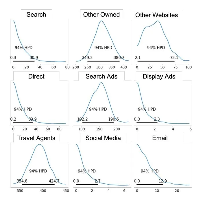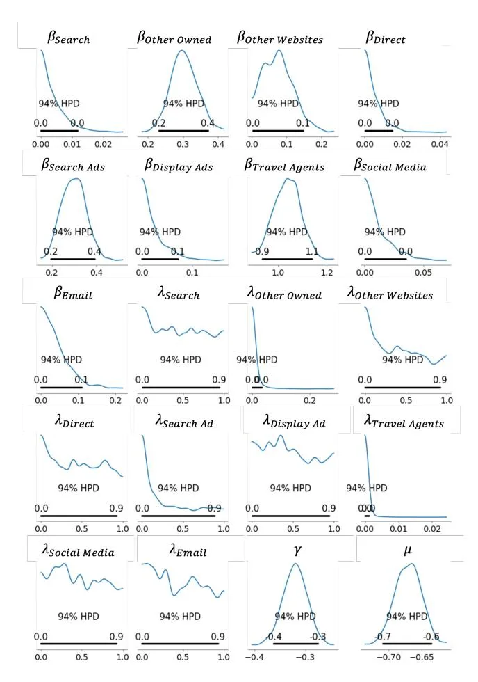 We plot the estimated posteriors for the parameters and the attributions in Figures 4 and 5 respectively. We see that intuitive phenomena are recovered by examining the sharp posteriors (bottom of Figure 4) for the parameters γ and µ. One interesting thing to note from Figure 4 is as follows. Whenever the β for a particular channel is estimated to be close to 0, the corresponding λ has a flat uninformative posterior, for example, βSearch and λSearch. This is reasonable given that we are multiplying some power of λ by a factor close to 0. On the other hand, whenever β for a parameter is estimated to be distinct from 0, we observe that the corresponding λ is close to 0, for example, βSearchAds and λSearchAds. This suggests that, for this dataset, the effect of the ads tend to decay very fast. That is, customer tend to forget the ad impression very rapidly.