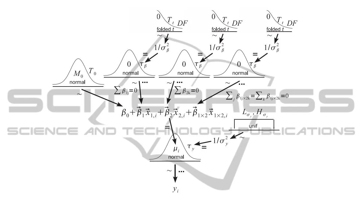 The following assumptions are made regarding the hierarchical prior: The observed data is assumed to be normally distributed around the predicted value or central tendency . As defined and illustrated by Kruschke (Kruschke, 2010), the equation above the observed data distribution in fig 2 illustrates that the predicted value is composed from the baseline plus additive deflection caused by each predictor individually, and interactive deflection caused by the combination of the given predictors. The basic assumptions about the respective can be found in the distributions in the top level of fig. 2. Here, we indicate that all are normally distributed around zero. The variances of all are estimated from the given data. The hyperdistributions are applied separately to the various predictors and interactions. This is due to the assumption that the magnitude of the effect of the predictive variable is probably not informative on the magnitude of the effect of (Kruschke, 2010).