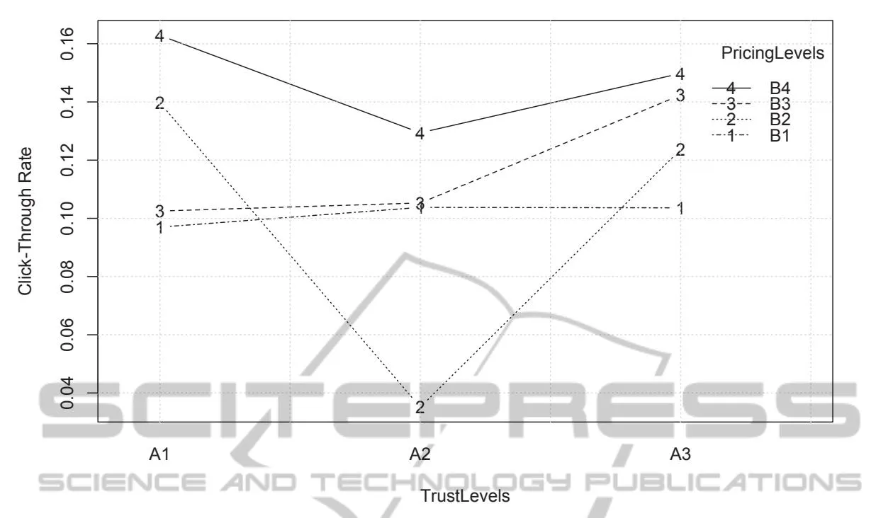 as x⃗1 and x⃗2. Both variables have several levels. x⃗1 includes “no trust information given” (x1A1), “unspecified test winner information given” (x1A2) and “concrete trust seal and test winner information given”(x1A3). x⃗2 includes “no pricing information”(x2B1), “no deposit”(x2B2), “percentage of savings given”(x2B3) and “concrete pricing information from database given”(x2B4). Although that we have an unbalanced study design and very few observations for one of the cases, we can see from fig 3 that ads with different contents gain significantly varying CT Rs.