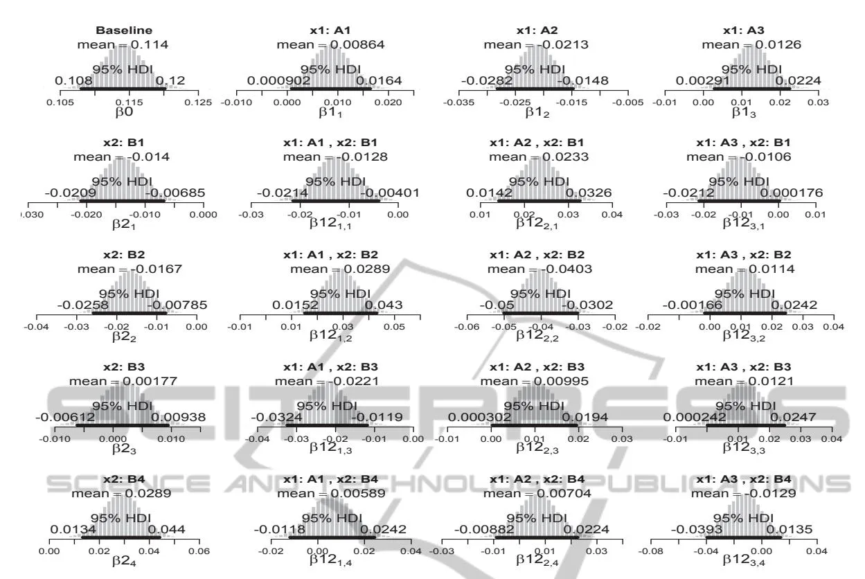 The results of the Bayesian analysis concerning the effects of the text features are shown in fig 4. The top left histogram shows that the baseline (β0) for the given combinations of text features is at 0.114. This is quite high in terms of average Click-Through Rates in Paid Search Advertising in general, at least for such a great number of queries as we observed within the test period in the context of the given campaigns. This could be a good hint for the fact that the campaigns have already been very well organized and optimized in terms of relevance to the specific queries that lead to the display of ads of the given advertiser on Search Engine Results Pages. Which influences selected text features have in such an environment can be seen in the remaining histograms in fig. 4. Each histogram illustrates deflections from the baseline for any given feature combination. The third histogram in the first row for example indicates that 95% of the most credible values that have to be subtracted from the baseline to describe the effect of the text feature “unspecified test winner information” fall in the area between 0.0282 and 0.0164 (β12) with the most probable value at 0.0213. What is really interesting and makes this kind of analysis so helpful in the case of unbalanced study design is the additional information concerning the 95% HDI (Highest Density Interval) for each estimation. This interval illustrates the area in which 95% of all credible parameter values for the respective level of a variable are situated. This becomes especially important when it comes to levels of a variable with only very few observed data points where the ingroup variance is estimated with the help of the prior