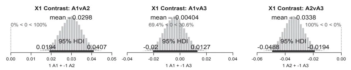 We estimate the effects for each of the groups but we are also interested in the answer to the question whether the groups are credibly different from each other. In typical A/B test scenarios for example this can be examined by applying an NHST t-test or a Bayesian Parameter Estimation of t-distributions for the comparison of two groups (Kruschke, 2012; Blask, 2013). For the case of more than two predictive variables this can also be done via contrast analysis in Multifactor Analysis of Variance (MANOVA).