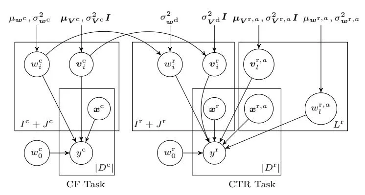 The graphic representation for the proposed transferred factorisation machines is depicted in Figure 1. It illustrates the relationship among model parameters and observed data. The left part is for the CF task: , , and work together to infer our CF task target , i.e., whether the user would visit a specific publisher or not. The right part illustrates the CTR task. Corresponding to CF task, and here represent user and publisher features’ weights and latent vectors, while and are separately depicted to represent ad features’ weights and latent vectors. All these factors work together to predict CTR task target , i.e., whether the user would click the ad or not. On top of that, for each (user or publisher) feature i of the CF task, its weight and latent vector act as a prior of the counterparts and in CTR task while learning the model.