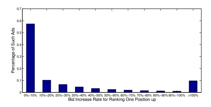 Figure 1: The proportion of ad volume ranking one position up with the increased bid price.