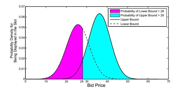 Figure 4 uses an example to explain the calculation of the probability . Suppose the bid of an observation is 28 (cents), then the probability equals to the product of the area of the left shadow (probability of lower bound < 28) and the area of the right shadow (probability of upper bound > 28).