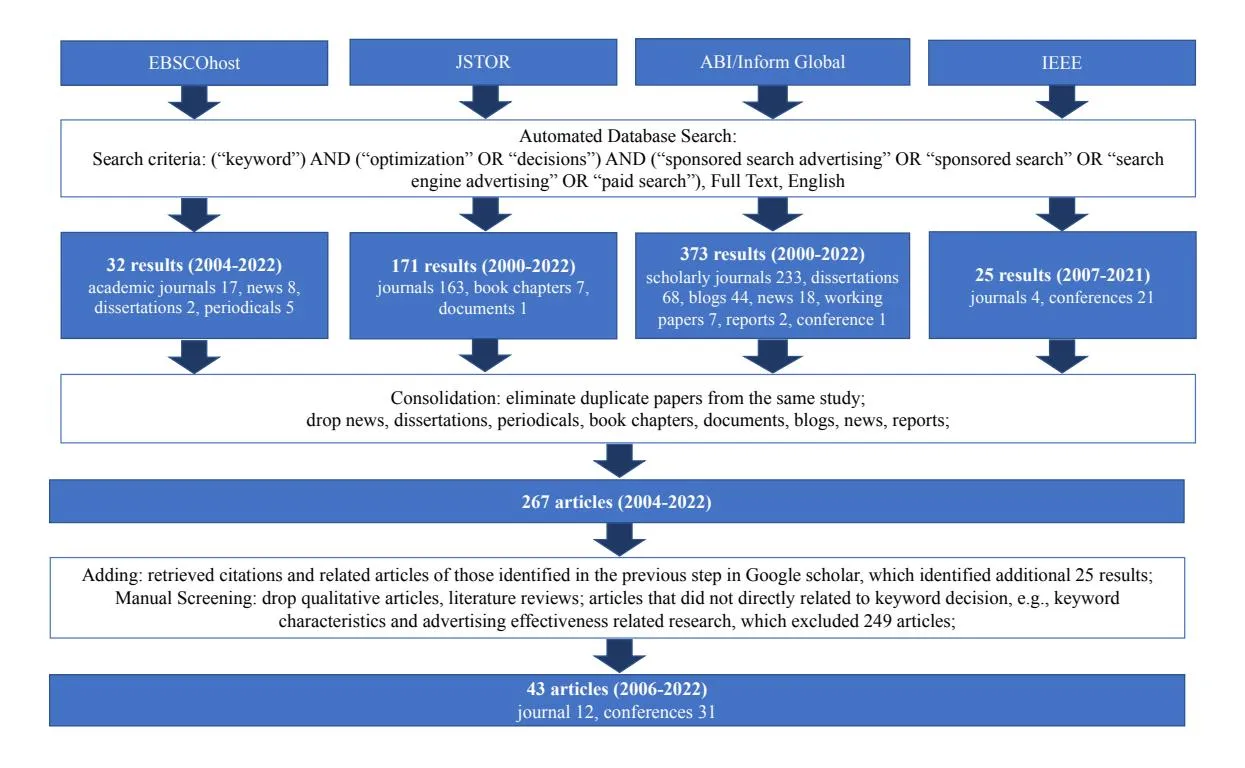 Due to the interdisciplinary nature of keyword decisions topics, research articles covered in this review were published in major IT-oriented (e.g., computer science, artificial intelligence and information retrieval) and/or business-oriented (e.g., management information systems, advertising and marketing) journals and conferences. Our review includes articles retrieved mainly from four academic databases: EBSCOhost, JSTOR, ABI-Inform and IEEE using full text search of (“keyword”) AND (“optimization” OR “decisions”) AND (“sponsored search advertising” OR “sponsored search” OR “search engine advertising” OR “paid search”). We restricted our selected studies in English. The search resulted in 32 results from EBSCOhost, 171 results from JSTOR, 373 results from ABI/Inform Global and 25 results from IEEE. We manually screened the results to eliminate duplicate articles, news, dissertations, periodicals, book chapters, documents, blogs, news and reports. This process led to 267 articles. Moreover, we expanded the literature by retrieving citations of the articles obtained in the previous step in Google scholar, which yielded additional 25 results. Furthermore, we dropped qualitative articles, literature reviews and empirical articles on keyword research, by going through title, abstract, full-text of each article, which excluded 249 articles. Finally, this literature search resulted in a selection of 43 research publications, including 12 peer-reviewed journal articles and 31 conference articles, covering the period from 2006 to 2022. Our search process is illustrated in Fig. 1.