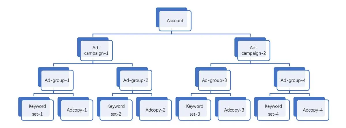 Section titled “2.2 Survey Structure”In SSA, a general advertising structure employed by major search engines (e.g., Google, Bing) can be described as: under a SSA account of an advertiser, there are one or several campaigns that are run simultaneously in order to fulfill a promotional goal; in the meanwhile, one or several ad-groups comprise a campaign, and each ad-group consists of one or more ad-copies and a set of keywords. Fig. 2 presents an illustration of the search advertising structure. In this sense, SSA is essentially distinct from traditional advertising (e.g., print ads and TV ads) due to its hierarchical advertising structure. Thus, advertising decisions in SSA are essentially structured, rather than flatted as in traditional advertising (Yang et al., 2012, 2019).
