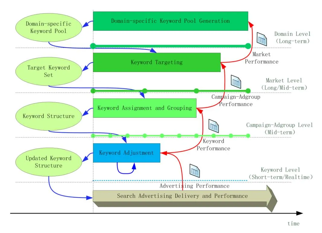 In SSA, firms need to choose suitable keywords to describe their products or services efficiently, and organize these keywords following certain advertising structures (e.g., account, ad-campaign, and ad-group) defined by major search engines. Once a user submits a query to a search engine which is related to one or several of these keywords, it triggers an auction process that determines which advertisements and their rankings to be displayed on search engine result pages (SERPs), together with a set of organic search results. In the SSA ecosystem, keywords are the unique carriers connecting advertisers, potential consumers, and search engines. Moreover, keywords are the basic units for advertisers to conduct online market research, design and evaluate marketing strategies. Keywords play a crucially important role in business competition for companies in online platforms. In practice, advertisers have to make various keyword decisions throughout the entire lifecycle of SSA campaigns (Yang et al., 2019). Therefore, it becomes a critical issue for search advertisers to make a series of effective keyword decisions in SSA.