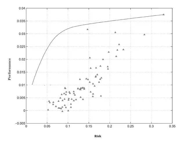 Fig. 1. Keyword-strategy Performance vs Risk for Search Advertising Note: Triangles represent individual keywords while the solid line represents the Markowitz efficient frontier, which consists of optimal keyword combinations that maximize performance for a given level of risk.