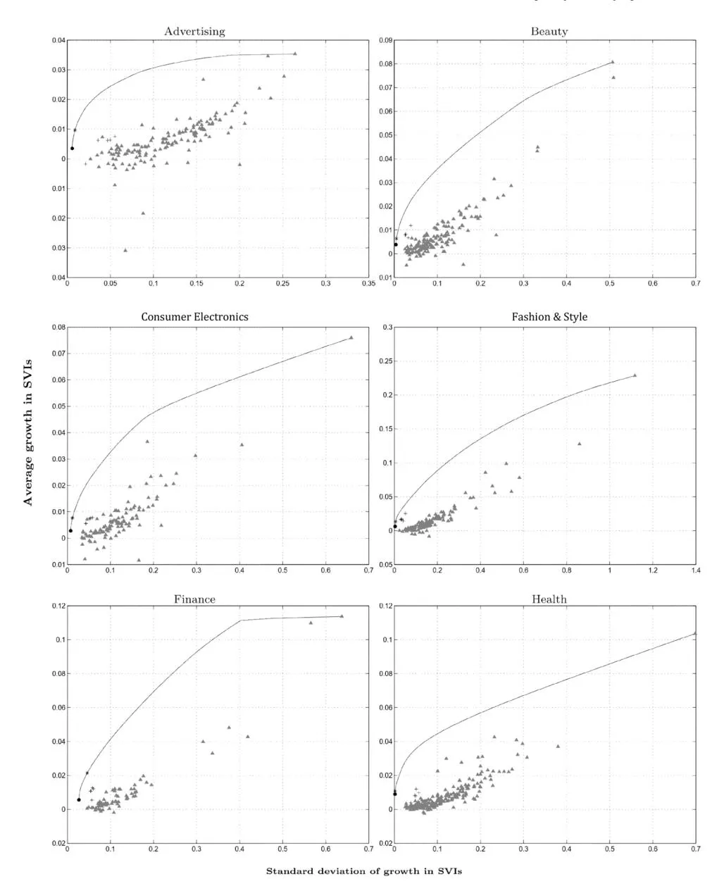the validity of the proposed approach and to assess its performance against alternative heuristic rules that are popular amongst practitioners. Specifically, the efficient frontiers of search advertising spend are estimated for 15 major sectors. Each point on the frontier represents an optimal portfolio of keyword investments that maximizes the expected overall growth in search intensity for a given level of risk. Data is drawn from Google Ad Words and Google Trends. As Google Ad Words penalizes irrelevant advertisers and provides a separate population of keywords available to bid for each sector, each sector has different efficient frontier. The first major finding is that for all sectors there is a strong positive relationship between keyword performance (average historical growth in popularity) and risk (standard deviation of growth). This adds validity to the proposed approach as mean-variance theory posits that riskier investments have higher expected returns. The second major empirical finding is that for all sectors, mean-variance optimal portfolios of keywords offer statistically significant improvements in performance over popular alternatives. The alternatives are based on heuristic rules that rank keywords on the basis of click-through rates, popularities and cost-per-reservation ratios, respectively.