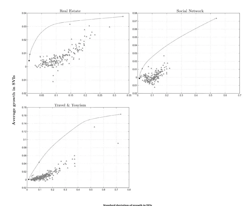 Another potentially useful practice from the financial industry is the use of Sharpe ratios to evaluate risk-adjusted performance of individual keywords in search advertising. These could be calculated as the average growth rate in SVIs over the standard deviation of growth rates. Financial practitioners use these as a way to evaluate portfolios and communicate information. Risk-adjusted measures such as the Sharpe ratio can also be used as a”quick and dirty” way for portfolio optimization (e.g., see Jacobs, Müller, & Weber, 2014; Rachev, Jašic, ´ Stoyanov, & Fabozzi, 2007). For example, the investment bank Goldman Sachs has launched an investment fund which consists of 50 stocks with the highest projected Sharpe ratio (see SEC filing on Goldman Sachs High Sharpe Ratio ETF, 2016). Building keyword portfolios on the basis of Sharpe ratios has two serious limitations compared to the optimization approach described previously. First, it cannot provide the optimal solution as it does not account for the effect of correlation between keywords. Second, it cannot accommodate differences in terms of advertiser risk preferences as it provides a single portfolio rather than a frontier. However, given its simplicity it may appeal to less sophisticated advertisers with very limited resources. It may also have some use when communicating results or for real-time decision support systems.